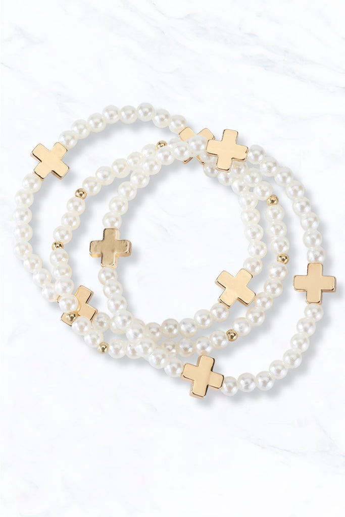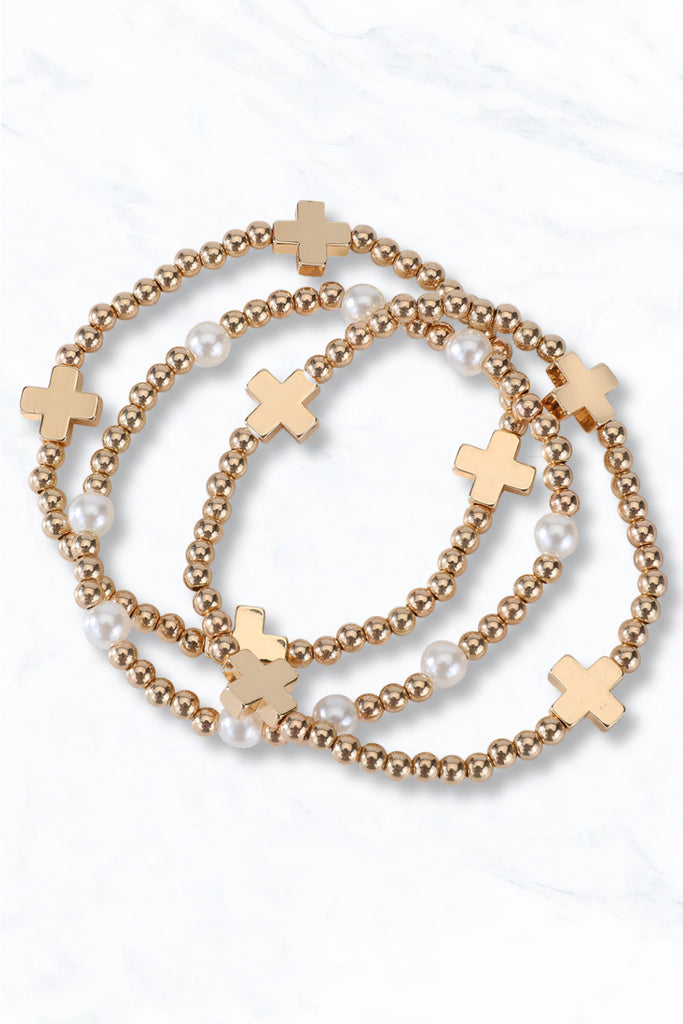 Gold Beaded Cross Bracelet Set with Pearl Accent