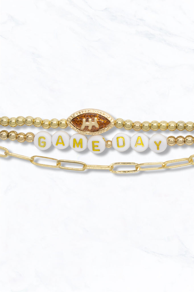 Get ready to cheer in style! This fun 3-piece bracelet set includes gold-tone beads, a GAME DAY letter bracelet, and a football charm centerpiece. A perfect sporty accessory for football fans.