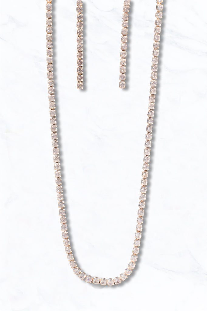 Add instant glamour with this sparkling rhinestone jewelry set. The matching necklace and earrings shimmer with brilliance, perfect for weddings, proms, and formal occasions.