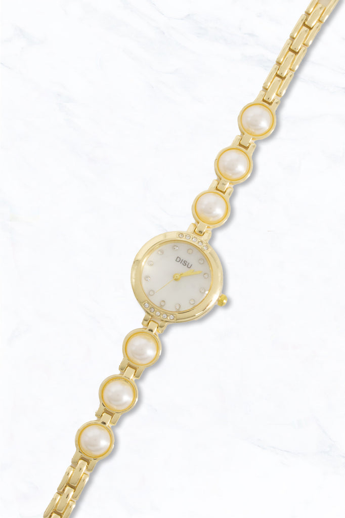 this gold-tone women's watch blends classic beauty with a touch of modern design. The bracelet features luminous pearl-style links that add softness and charm, while the delicate round face shimmers with crystal accents.
