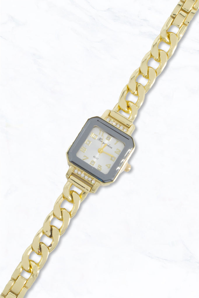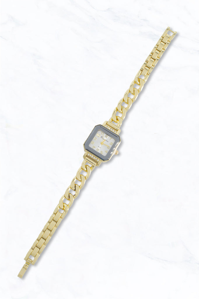 The bold gold chain link band is accentuated by a crystal-lined bezel and a clean, easy-to-read dial. Perfect for women who appreciate a mix of strength and style.
