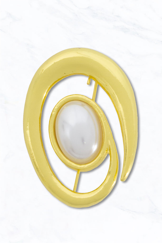 A striking blend of art and elegance. This swirl-shaped gold brooch wraps gracefully around a smooth pearl centerpiece, symbolizing femininity and flow. Lightweight yet durable.
