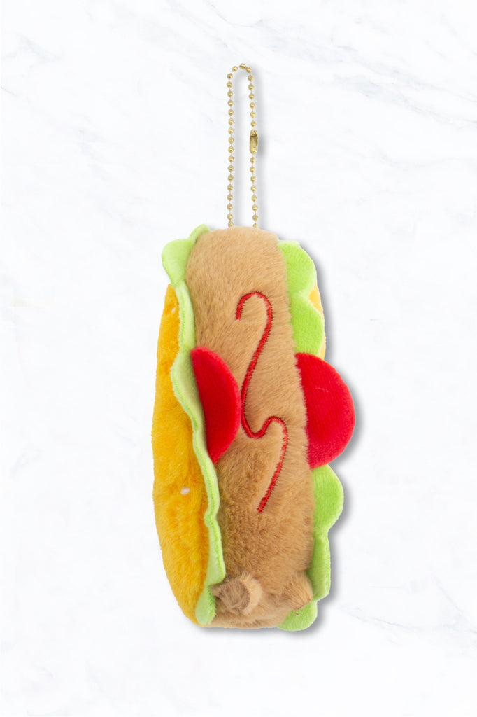 Add some flavor to your day with this adorable hot dog plush keychain! Made of super-soft fabric with bright ketchup  details, it's perfect for hanging on your backpack, purse, or keys.