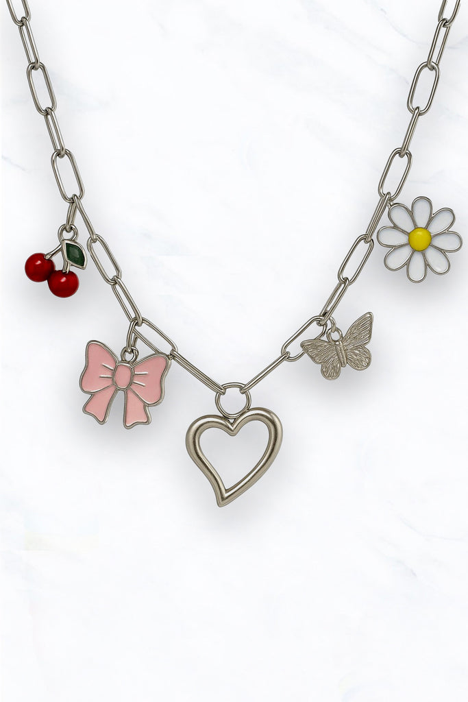Charming gold-tone necklace featuring a mix of adorable enamel charms, including a heart, butterfly, daisy, and cherries.