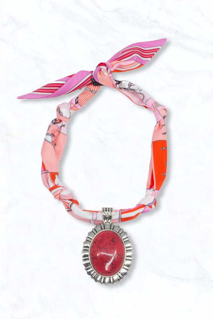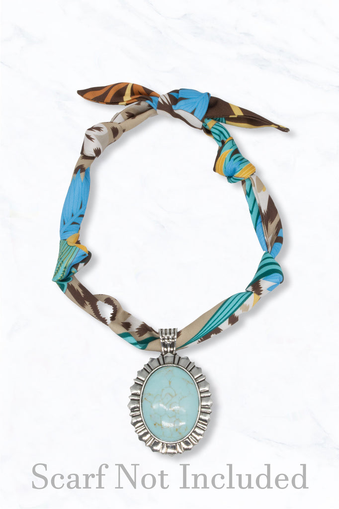This oval pendant captures Southwestern elegance with a turquoise-style stone encased in a textured scalloped silver border. Great for a bold yet graceful look.