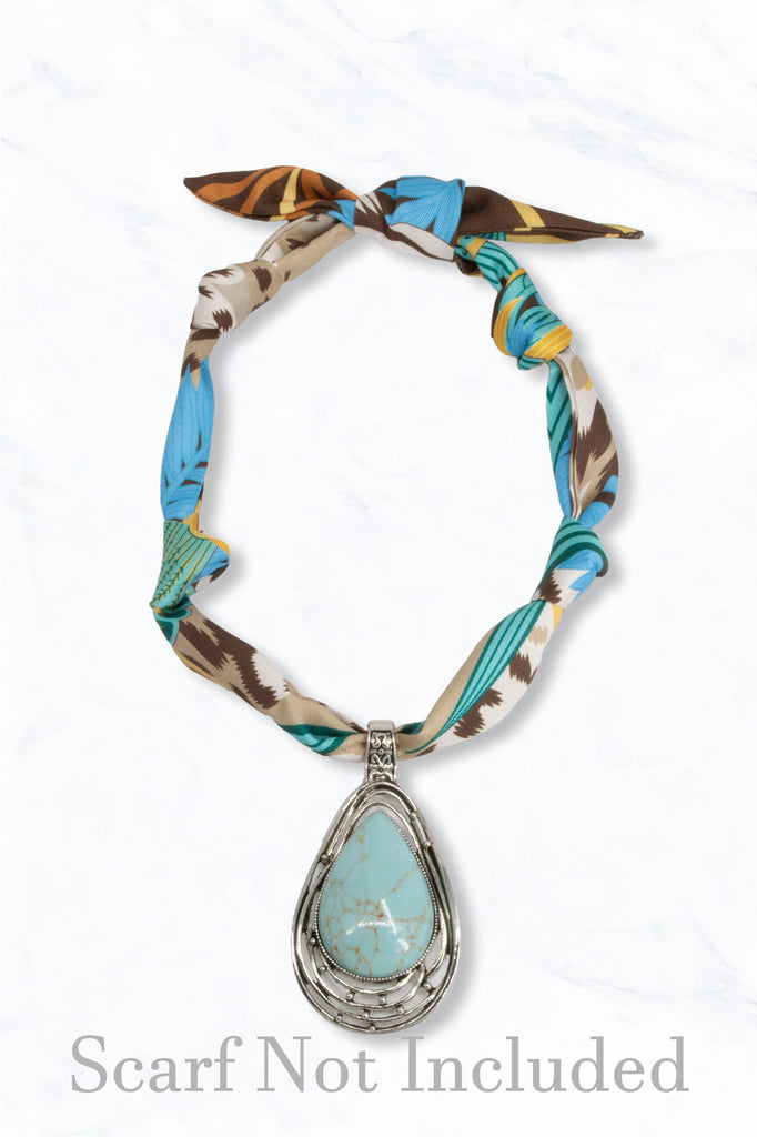 A stunning layered teardrop pendant featuring a turquoise-style stone framed in detailed silver rings. Timeless and artistic for everyday or statement wear.