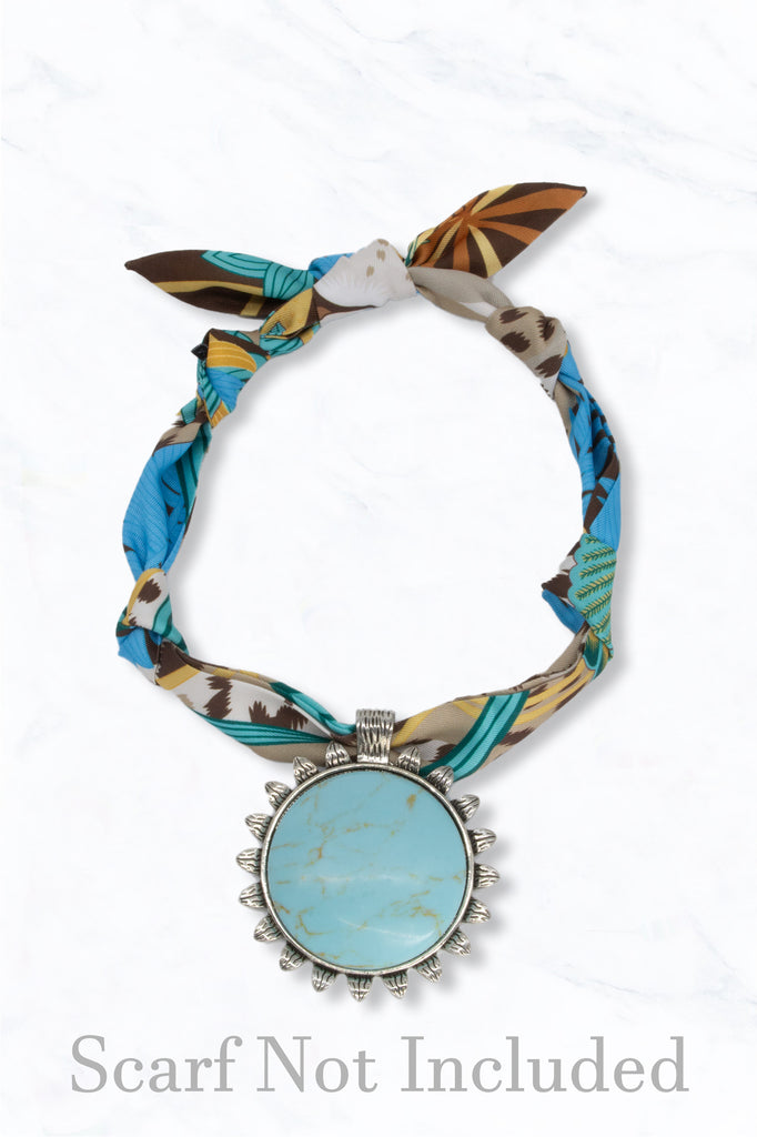 This radiant round pendant features a turquoise-style stone encircled by a sunburst silver pattern. Perfect centerpiece for your favorite chain or scarf.