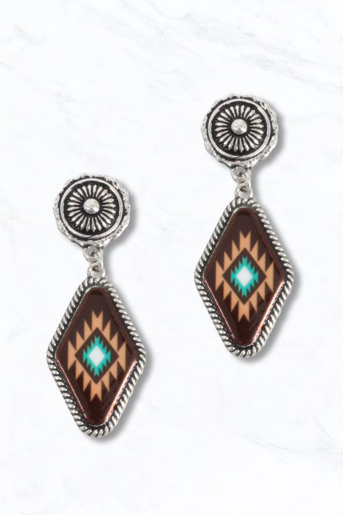 Southwestern-inspired earrings featuring Aztec diamond patterns with turquoise-tone centers. Framed with rope-style silver edges for a rustic Western charm.