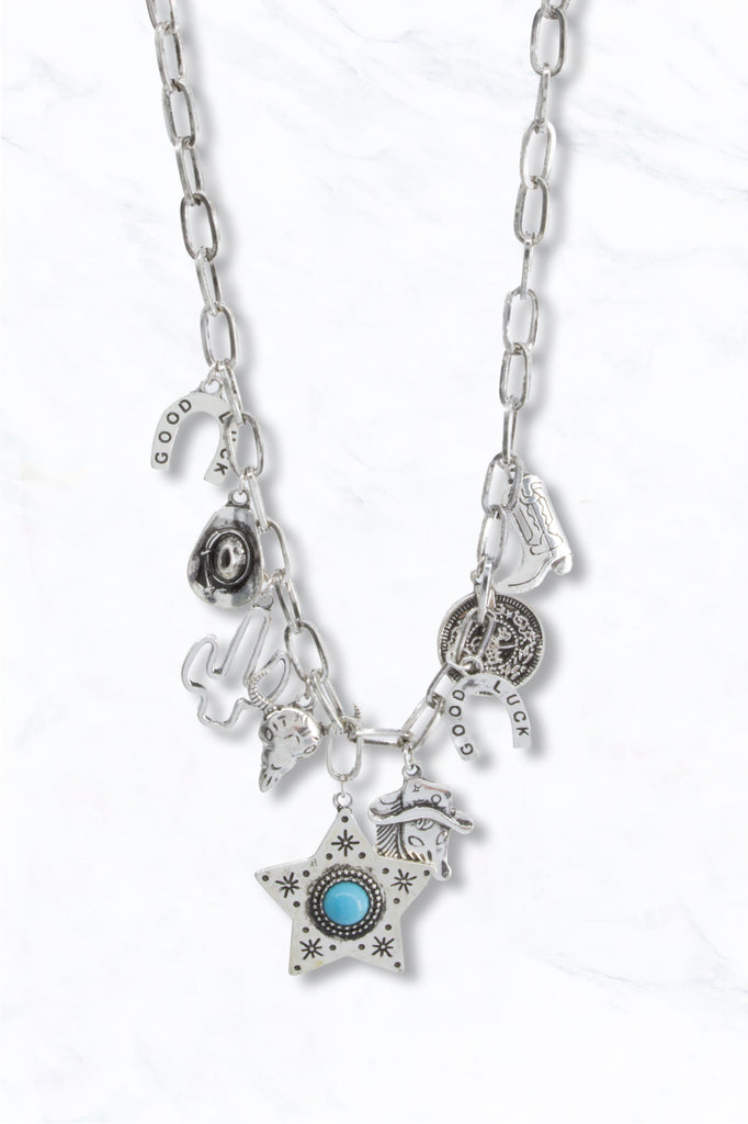 featuring multiple detailed pendants including a cowboy hat, cactus, horseshoe, steer skull, and turquoise star centerpiece.